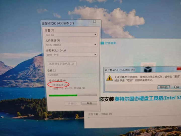 再然后我插电脑识别盘符后,又用快速格式化快速清空了一下,再往里面装电影,速度就好慢。本来想用英特尔官方硬盘工具(Intel SSD Toolbox)去修复,结果识别不到移动硬盘的盘符,别的第三方软件我又没用过,不敢轻举妄动。